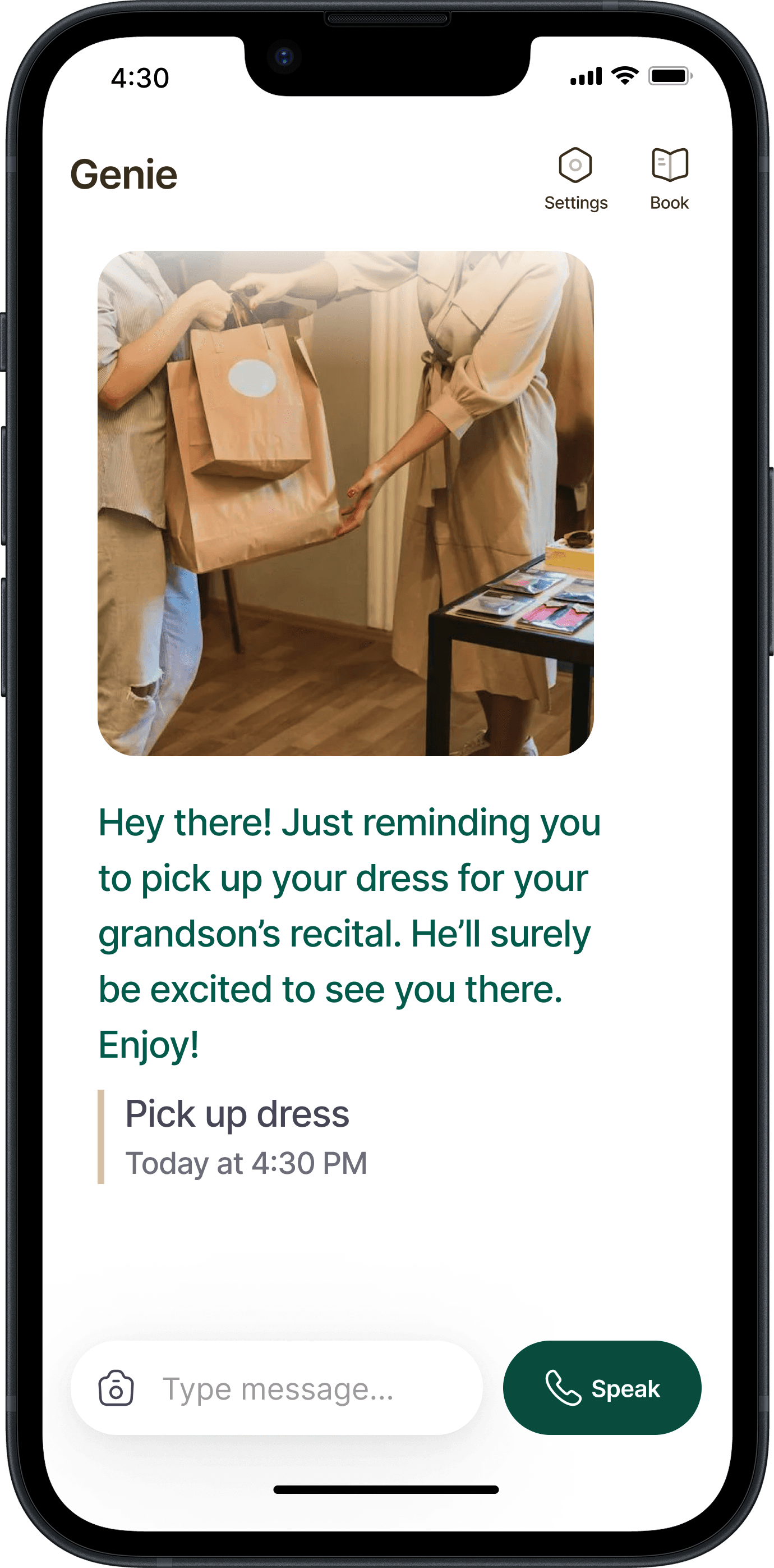 Seniors can choose how Genie reminds them –– through a helpful text or a friendly call.