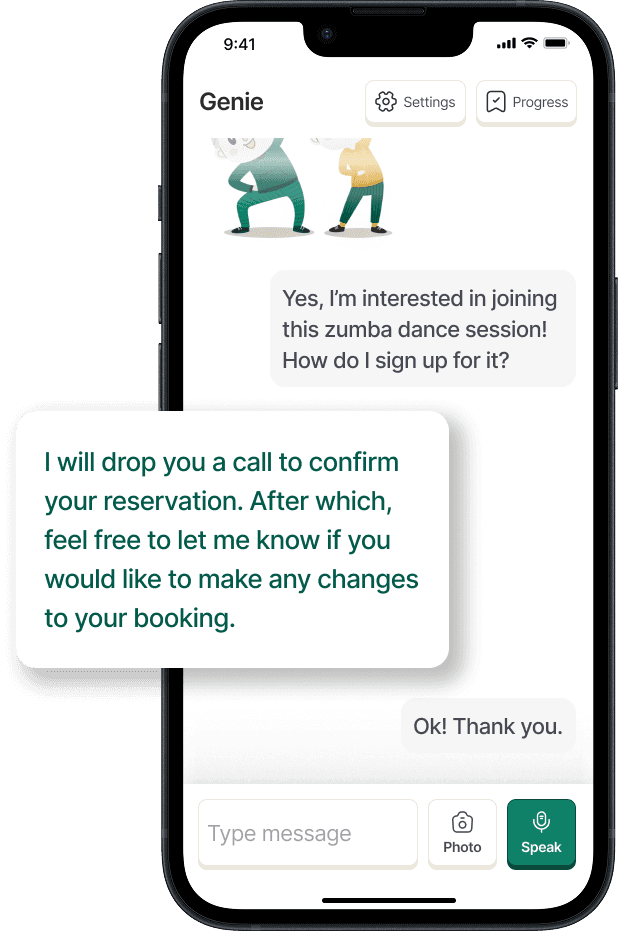 Prior to the activity, Genie handles reminders and attendance confirmation for seniors. This attendance is then seamlessly updated for the organizer, without requiring any input from the senior
